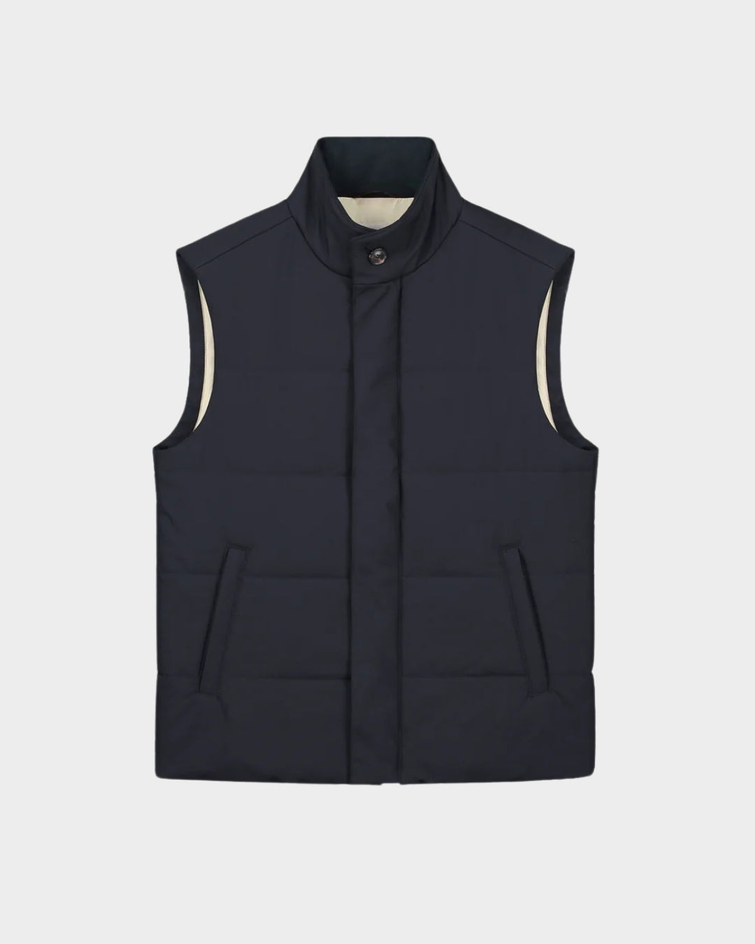 Zo zacht als Cashmere met een zijde glans. Deze bodywarmer is gemaakt in Italië van waterdichte shell, licht gevuld met isolerende vulling, zodat hij je warm houdt maar niet lomp aanvoelt. De trechtervormige hals houdt de kou buiten en de tweewegritssluiting maakt layering eenvoudig. Perfect voor sport, reizen en vrije tijd.
